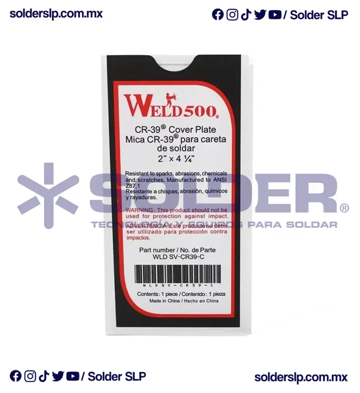 Los soldadores profesionales ahora usan micas protectoras CR39 en lugar de vidrios claros.En una prueba pusimos una mica CR-39 Weld500® a lado de un vidrio claro y soldamos por 5 minutos, el resultado es claramente favorable a la mica. En el vidrio se pegaron todas las chispas, mientras que en la mica no.